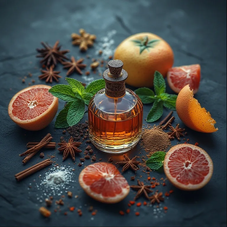 Parfumul se deschide precum lumina soarelui care sparge iarna - mandarină strălucitoare, nesăbuită, plină de suc și coajă lipicioase, grapefruit acrișor care își răsucește marginea cu ceva ușor periculos. Apoi, menta lovește, ascuțită ca o lamă între dinți, răcorind punctele de puls înainte ca mirodeniile să se strecoare: cardamom crăpat, piper roz bâzâind ca static, o curbură lentă de scorțișoară încălzind baza.Apoi, chihlimbarul se revarsă, auriu și rășinos, prinzând fibra aspră a pielii uzate - genul care scârțâie la fiecare mișcare, îmbibat în fum vechi și bourbon. Sub toate acestea, lemnul zumzăie întunecat și constant: cedru ca o cocă de navă, vetiver cu strânsoarea sa pământie, lemn de santal arzând lent ca jarul. Nu stă doar pe piele - se mișcă, neliniștit, viu.