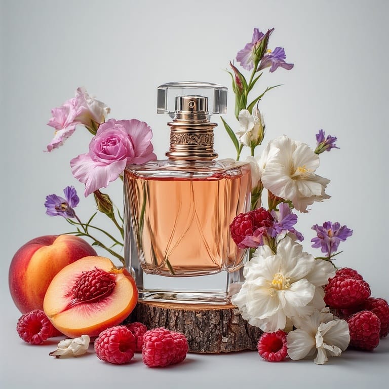 Note: Fructe rosii, zmeura, trandafir, violete, piersica, muscata rosie, iris, mosc alb, lemn de cedru